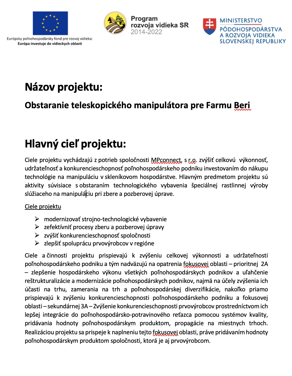 Ciele projektu vychádzajú z potrieb spoločnosti MPconnect, s r.o. zvýšiť celkovú výkonnosť, udržateľnosť a konkurencieschopnosť poľnohospodárskeho podniku investovaním do nákupu technológie na manipuláciu v skleníkovom hospodárstve. Hlavným predmetom projektu sú aktivity súvisiace s obstaraním technologického vybavenia špeciálnej rastlinnej výroby slúžiaceho na manipuláciu pri zbere a pozberovej úprave.